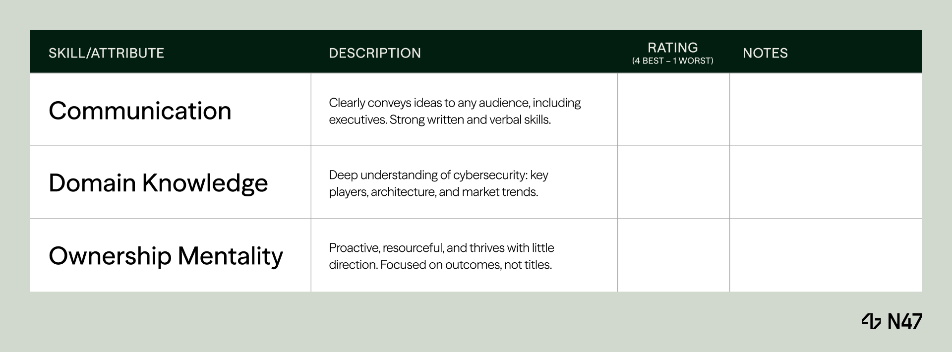 This approach ensures you gather consistent, relevant feedback while making the best use of everyone’s time. We’re all busy, but preparing before each interview helps us collect meaningful data points and avoid subjective decision-making.