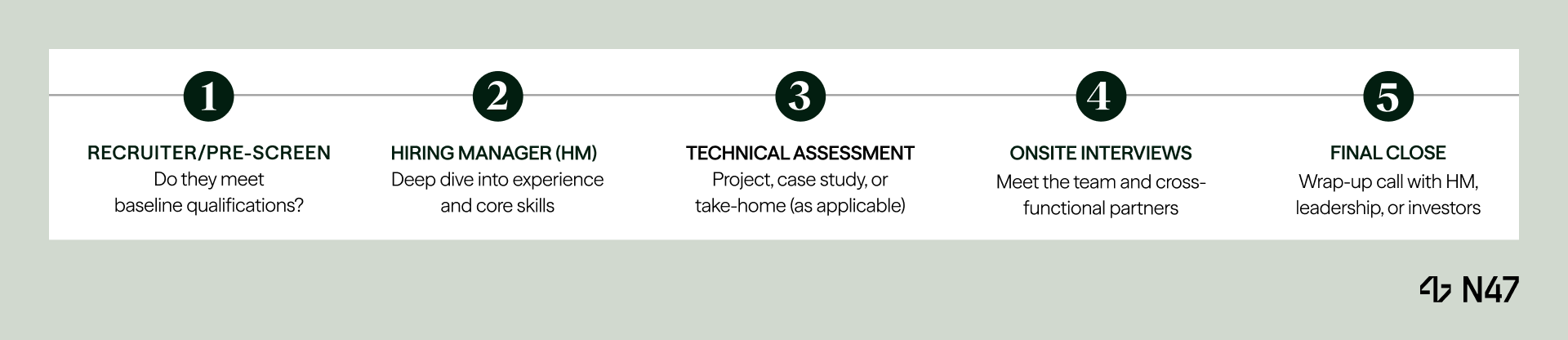 An effective process signals to candidates that you’re serious, thoughtful, and invested, not just in hiring them but in building the best team possible. And remember: your employer brand is always on display, especially in early-stage hiring. A disorganized or poor process can be a big turnoff for top talent and even cause them to dissuade their network from interviewing with you.