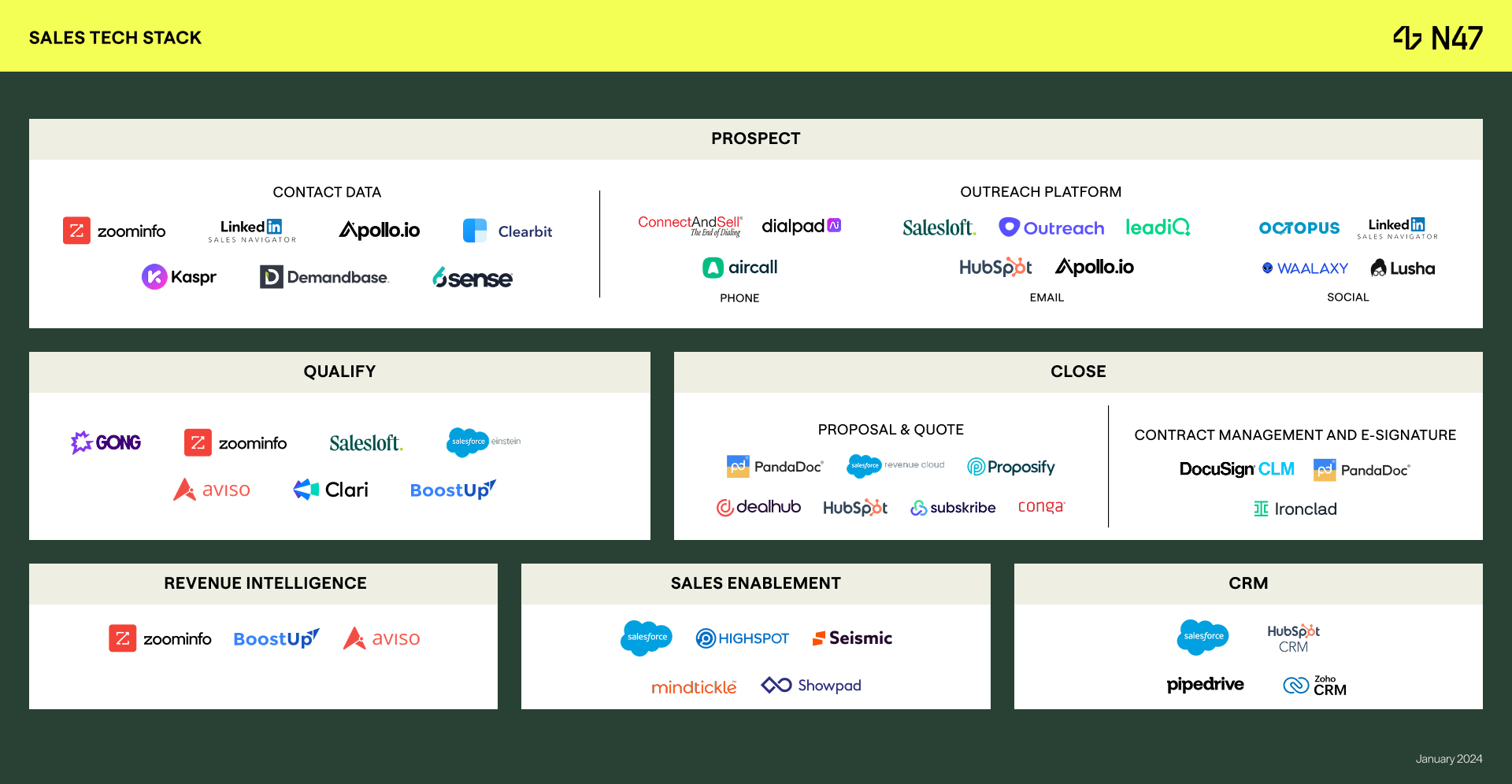 In this category, LinkedIn Sales Navigator is an important tool that provides accurate information on companies and contacts that would be ideal for outreach. In addition to LinkedIn, teams also need to understand which accounts are displaying buying intent signals and contact data. Larger providers such as Zoominfo, Demandbase, and 6Sense offer end-to-end tools while more use case-specific tools such as LeadIQ, Apollo.io, Clearbit, and Kaspr offer pieces that cover specific aspects of contact/prospect engagement.